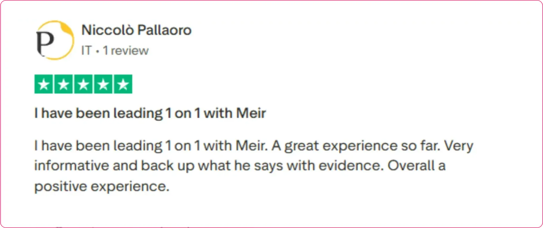 • Private 1-on-1 coaching with Meir Velenski at a discounted price, based on availability